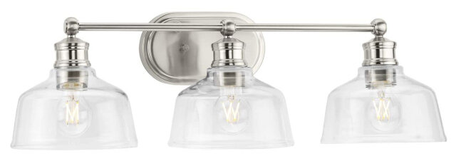 3 LIGHT VANITY FIXTURE WITH GLASS SHADES HINGING FROM STRAIGHT BAR BRUSHED NICKEL - CLEAR GLASS SHADES